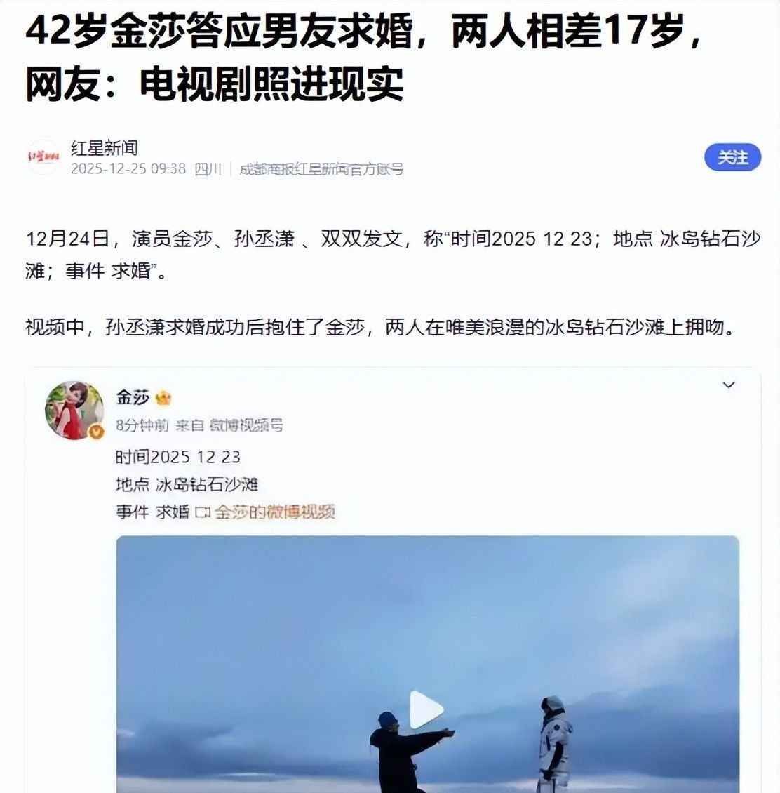 42岁金莎答应男友求婚,两人相差17岁,网友:电视剧照进现实.红星新闻.2025-12-25